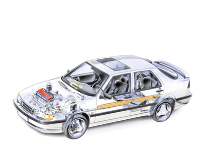 Стремление компании Сааб выпускать только четырехцилиндровые двигатели для своих автомобилей неизбежно толкало новую модель "9000" на тот же самый путь, по которому прошли предыдущие успешные модели "99" и "900"- применение турбонаддува для улучшения характеристик двигателя и динамических показателей автомобиля.